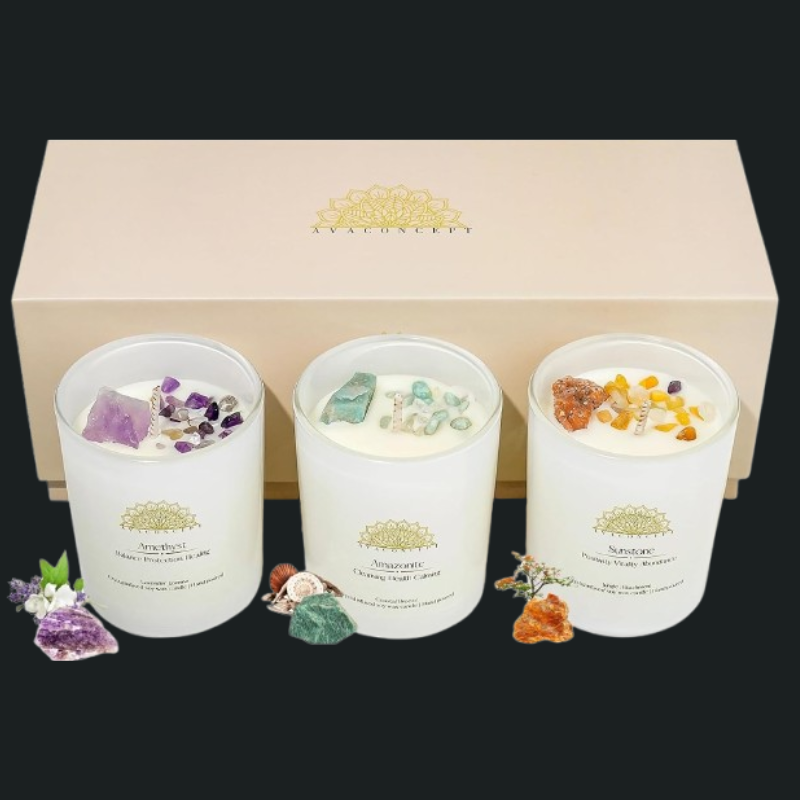 A luxurious gift set featuring amethyst and smoky quartz crystal candles — perfect for gifting or treating yourself to some sacred self-care.